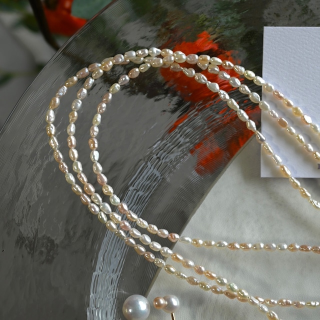 〈販売月目安:無くなり次第終了、2月POPUP販売未定〉 Babyと申します。 柔らかいカラーでくしゅっとしたパールの未完成な感じがとても愛おしく初心なカラーが守ってあげたくなるようなそんなパールでフルパールネックレスをお作りしました。 ▼パール(真珠)について 淡水パール シワ(くしゅっと感)がある可愛らしい小粒パールなので、綺麗目になりすぎずカジュアル使いにはぴったりのパールです。 柔らかいピンク、オレンジ、クリーム色など同系色の色味が複数混ざったマルチカラーですが、全体で見た時の色味バランスがピンクベージュなのがなかなか見ないカラーなので心惹かれます。 ▼パールの大きさ 約4mm ライス形(縦長) ▼セット使い 制作過程でチャーム挟んでみたり、ビーズ挟んでみたりしたのですが、この初心な雰囲気を壊すのはなんとも勿体なかったためシンプルに仕上げました。 triplets/三つ子ちゃん耳飾りは色味の系統が似ているのでばっちり似合いますが、ハートパール・ボーリングピン耳飾りなど柔らかい色味の耳飾りとも合わせても綺麗にまとまります。 ムーンラインストーンネックレス、シンプルチェーンロングネックレスとの重ね付けもおすすめですが、華やかに組み合わせたいときは他のフルパールネックレスとの贅沢な重ね付けでもこってりしすぎない繊細なBabyちゃんです。 ▼留め具 全長約55cmの内アジャスターが5cmを標準でお付けした価格でございます。アジャスター不要の方は備考欄にご記入ください。 ▼発送期間 販売期間:1/23(金)18時-25(日) 発送期間:2/9(月)-10(火) ※ お急ぎの方はご購入前にご相談くださいませ。 ▼梱包について ソフトアクセサリーケースに入れてお届けします。1〜2商品ごとに1つお付けしています。 お渡し用袋は無料でお付けできますので、ご希望の方は備考欄へご記入ください。有償のギフトボックスをご希望の方は併せてもご購入くださいませ。 ▼その他詳細 パール:淡水パール(天然色) その他:14kgf 重さ:約10g ▼素材について https://kanew.shopselect.net/p/00004 ◇ 天然石・パールは自然の中で形成されるものの為、 写真には写らない小さな傷・小さな黒点・くぼみ・皺・色むらがある場合がございます。 ※ご購入いただく前に下記のURLページを必ずご確認ください。ご了承いただいてから、ご購入いただきますようお願いいたします。 https://kanew.shopselect.net/items/57957658