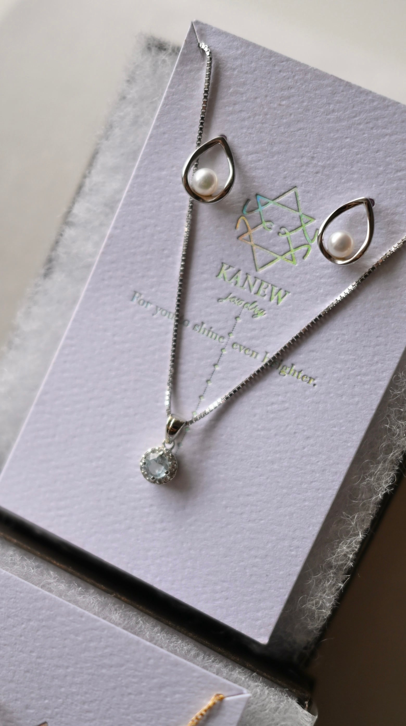トパーズの中でも涼しげな首元を演出してくれるスカイブルートパーズをsilver925 14金/ロジウムメッキ加工で包み込んでおります。