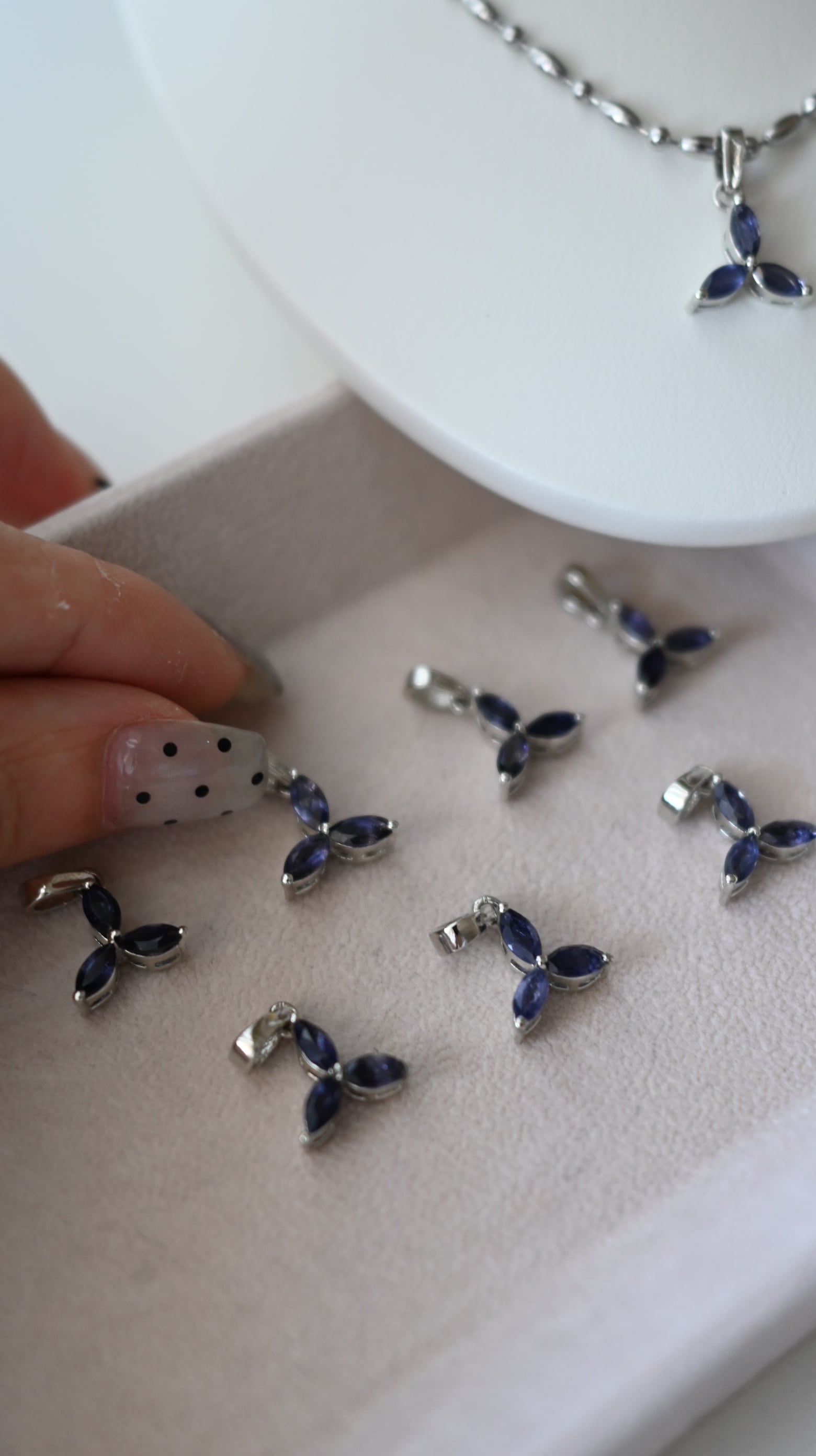 サファイアと似た見た目を持つことからウォーターサファイアとも呼ばれています。美しいすみれ色ですので、ペンダントトップの形もフラワーモチーフに熟練の職人さんにお願いしてお仕立てしております。