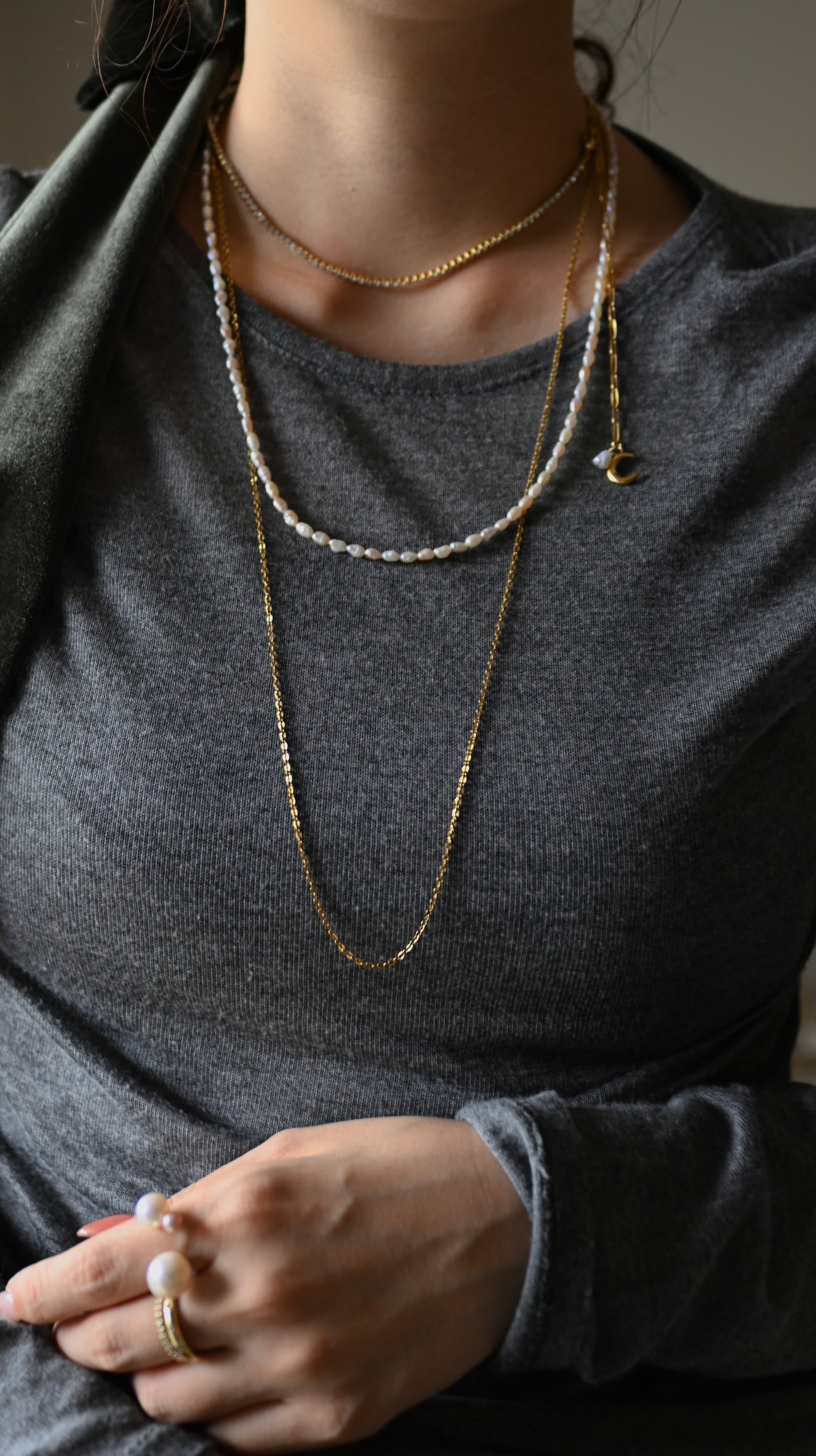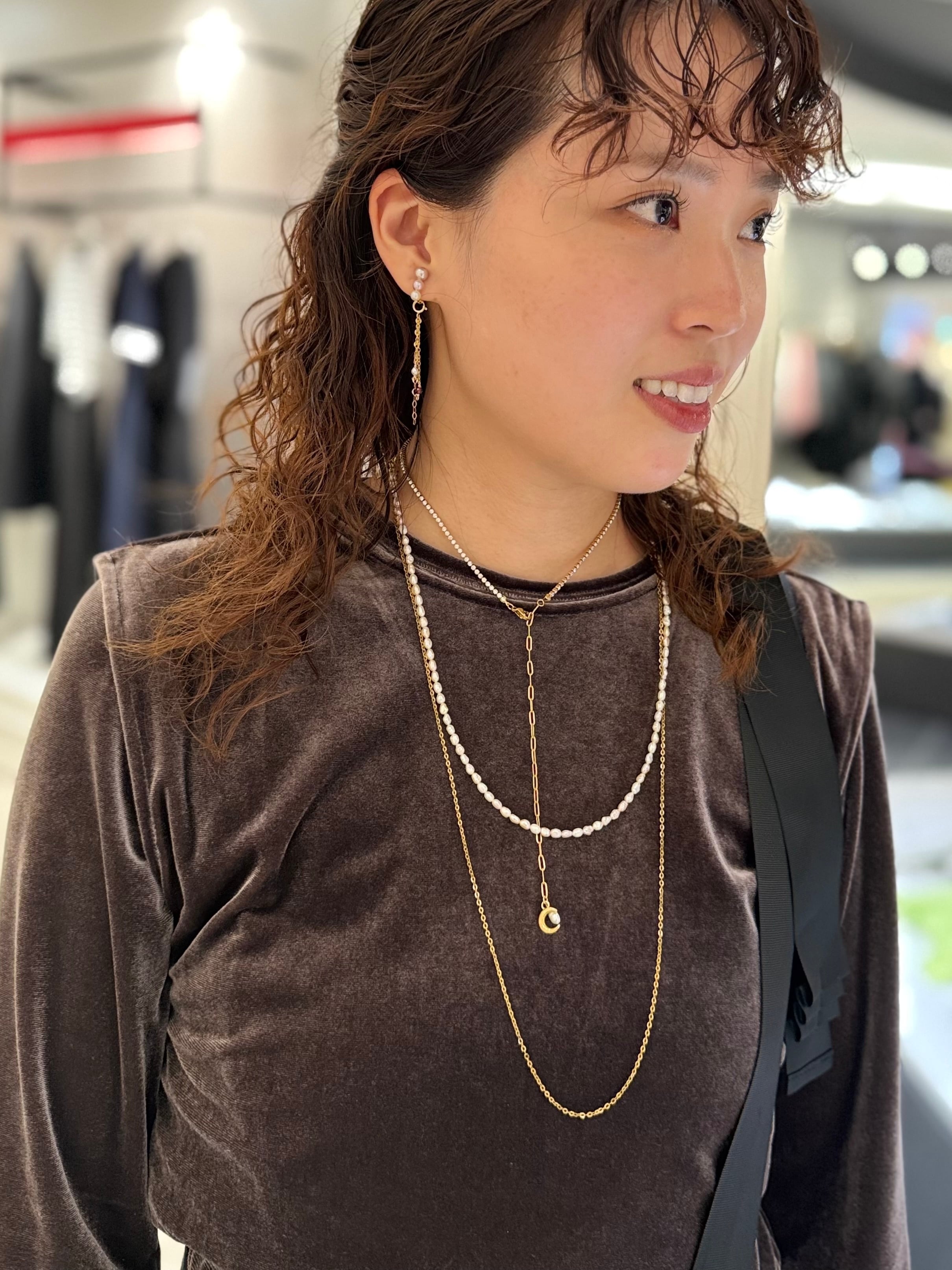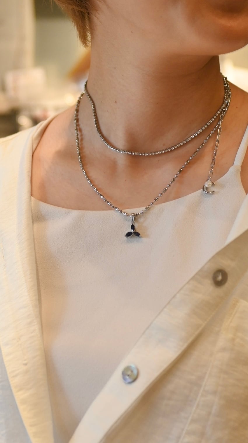 首元はラインスーンが一周し、見せるアジャスター代わりのボックスチェーンが長めにつているのでチョーカーやネックレスとしてお使いいただけます。先端にはムーンチャームと淡水パールが付いていいます。ラインストーンは星をイメージしているので、澄んだ冬夜空のような少しロマンチックなデザインに仕上がりました。