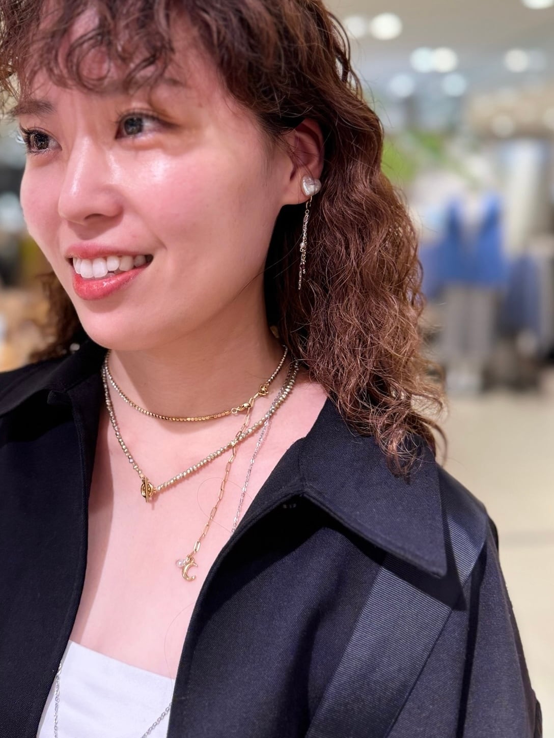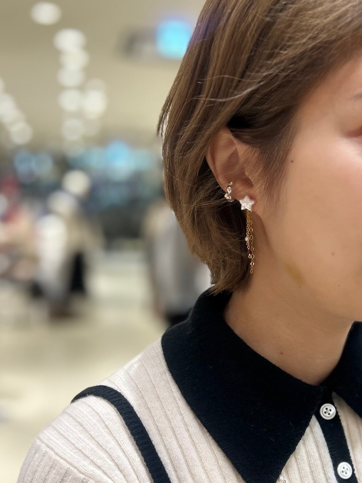 ネジバネ式の金具部分(画像4枚目参照)に引き輪で取り外しが可能です。正面からは耳たぶ下からシャリシャリが見えます。