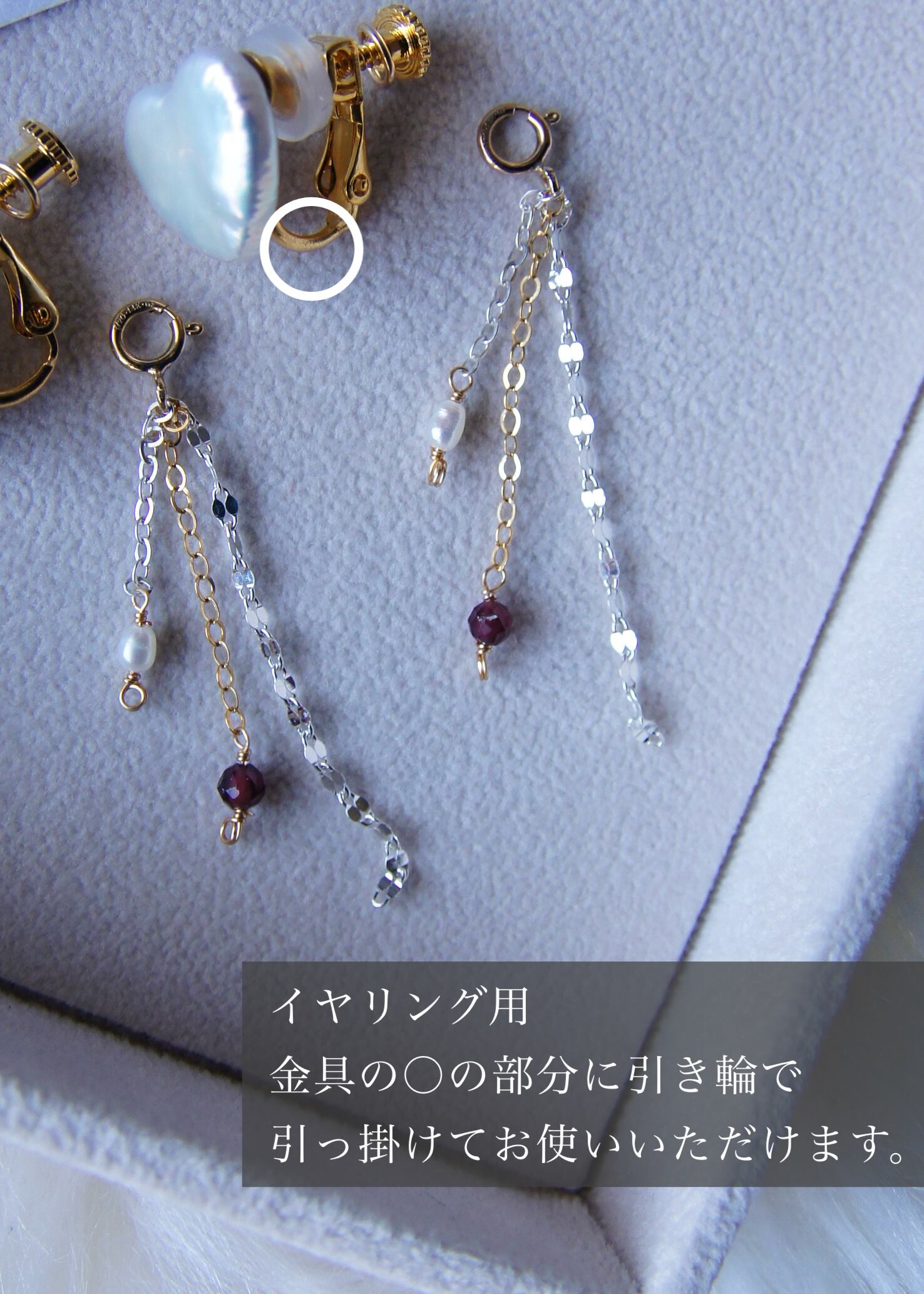 14kgf(ゴールド色)、silver925(シルバー色)の上質な素材を使用し様々な耳飾りに動きと輝きをプラスしてくれます。