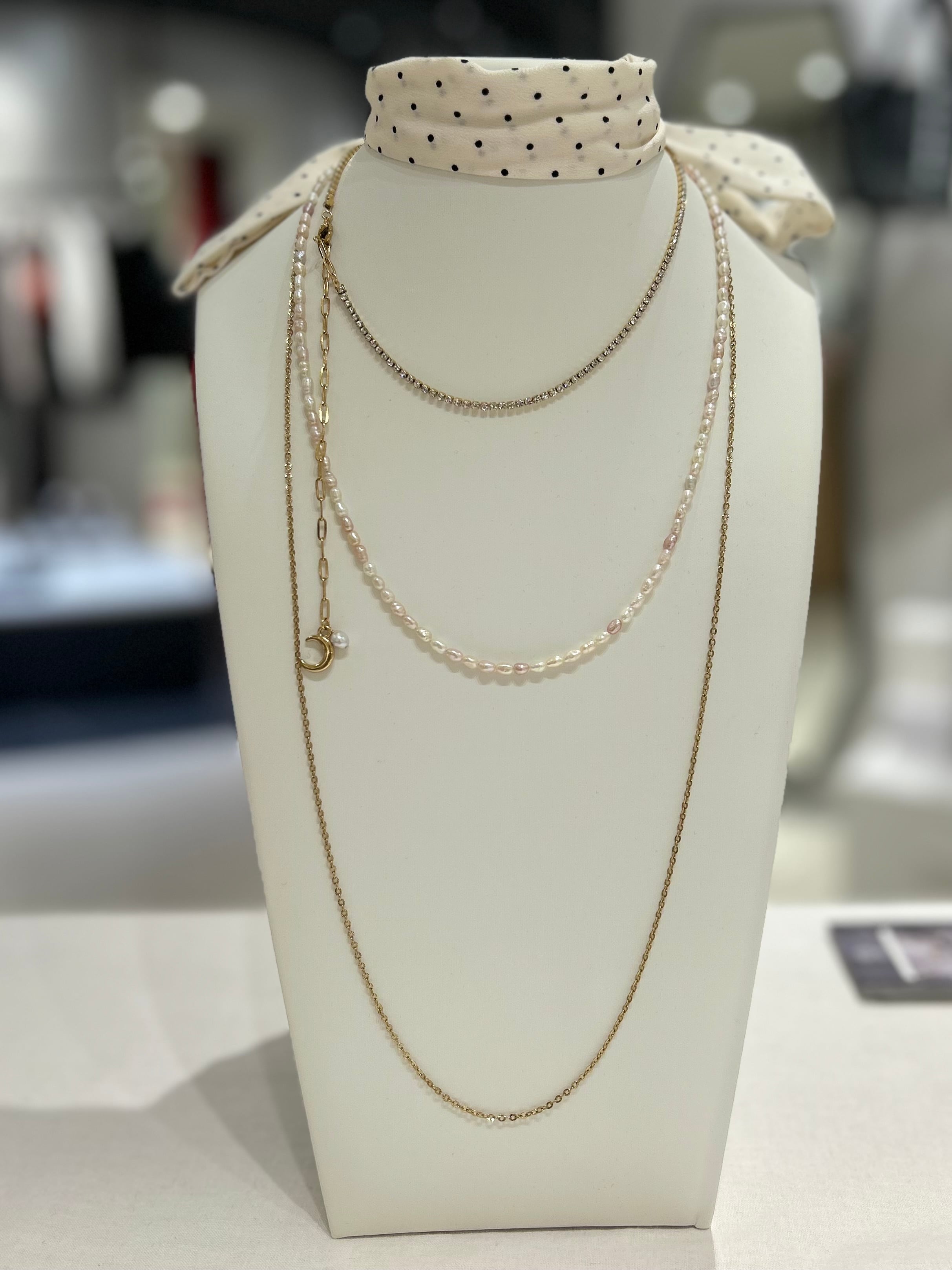 ムーンラインストーンネックレス、シンプルチェーンロングネックレスとの重ね付けもおすすめですが、華やかに組み合わせたいときは他のフルパールネックレスとの贅沢な重ね付けでもこってりしすぎない繊細なBabyちゃんです。
