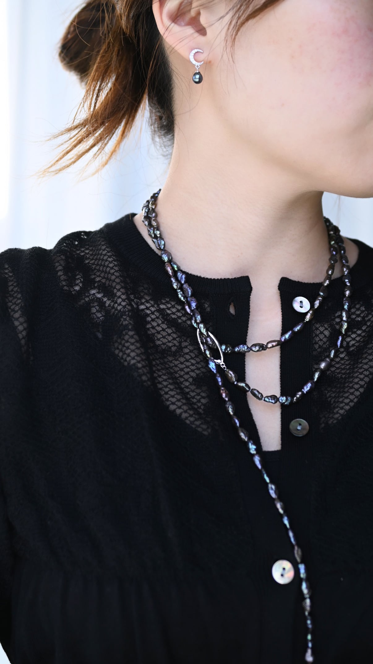 くしゅっとした表情豊かなミステリックカラーを使い、これまたバリエーション豊かに付けれるロングパールネックレスにお仕立てしました。