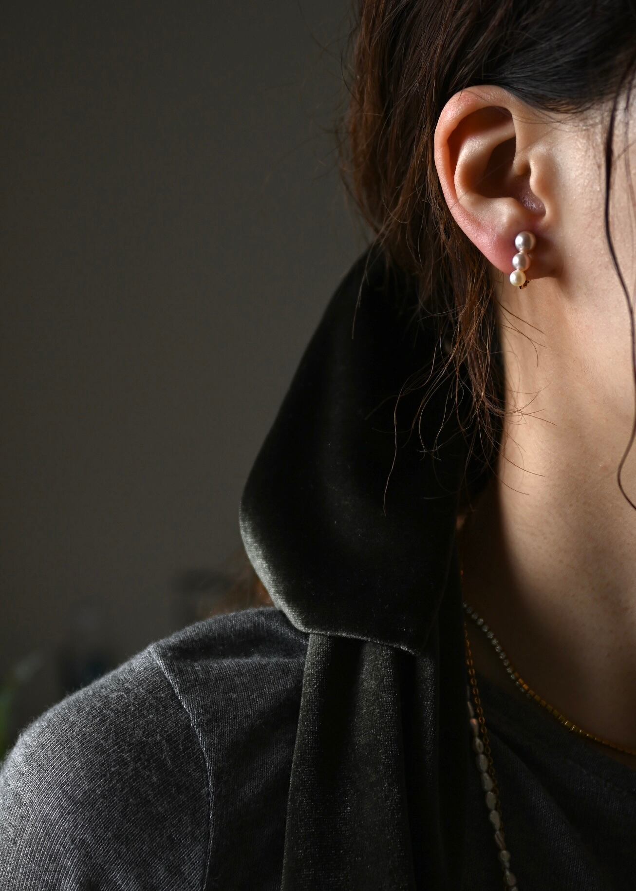 雫がしたたるようなイメージでサイズの異なるパールを連ねおり小粒ながら存在感を感じる耳飾りです。